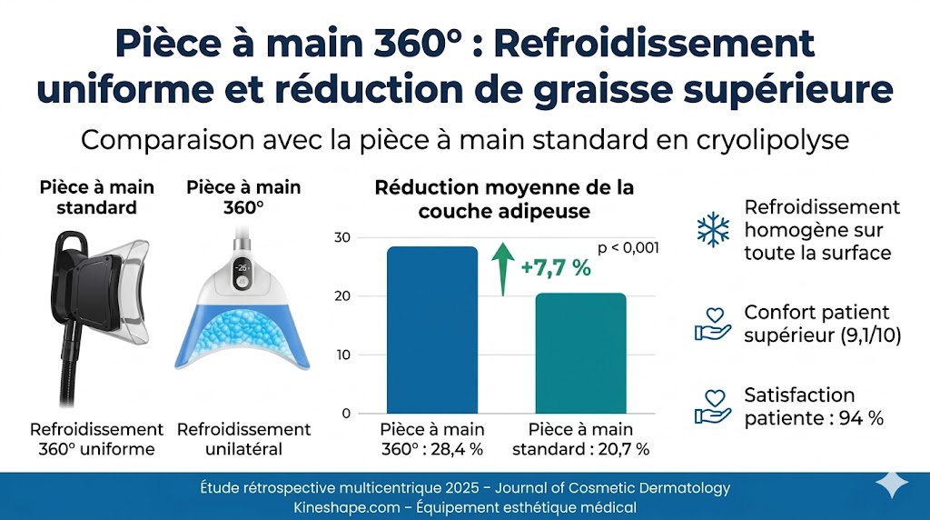 L?analyse des données a montré une réduction moyenne de la couche adipeuse de 28,4 % avec le handpiece 360° contre 20,7 % avec les pièces à main standard (p < 0,001).