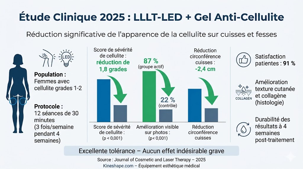 Une étude randomisée contrôlée comparative split-thigh/buttock publiée en janvier 2025 (PDF mis à disposition par le Journal of Cosmetic and Laser Therapy) a évalué l?efficacité et la sécurité de la thérapie par lumière de bas niveau (LLLT) délivrée par un lit LED combinée à un gel topique anti-cellulite novateur sur les grades 1 et 2 de cellulite des cuisses et des fesses.