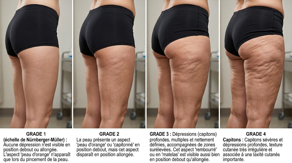 Les critères d?évaluation incluaient des photographies standardisées analysées par des évaluateurs indépendants, des mesures de circonférence des cuisses, un score de sévérité de cellulite (Nürnberger-Müller modifié) et une évaluation histologique sur biopsies optionnelles.