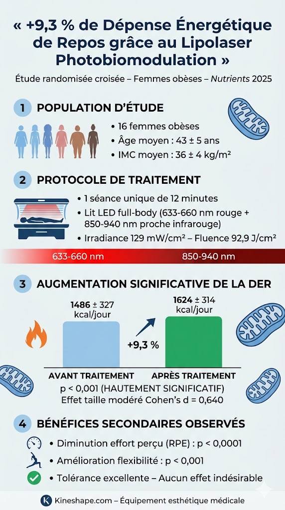 L?objectif était de mesurer l?impact d?un système de lipolaser LED full-body sur le métabolisme basal, une approche non invasive particulièrement pertinente pour la gestion du poids localisé et la réduction de graisse en Europe et aux États-Unis.