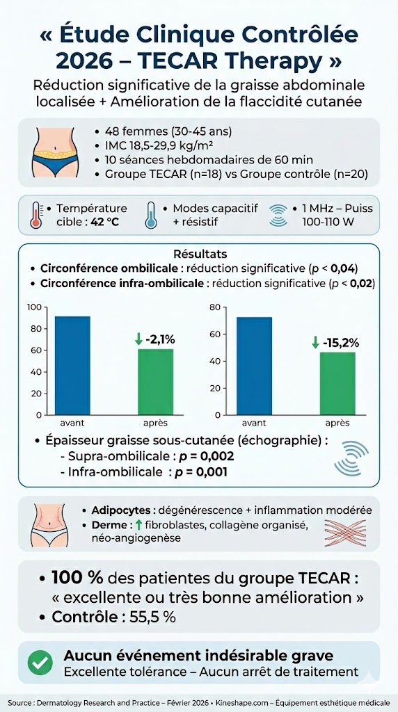 Une étude clinique contrôlée randomisée multicentrique publiée le 23 février 2026 dans la revue Dermatology Research and Practice a évalué l?efficacité et la sécurité de la thérapie TECAR (Transfert d?Énergie Capacitive et Résistive) pour la réduction de la graisse abdominale localisée et l?amélioration de la flaccidité cutanée.