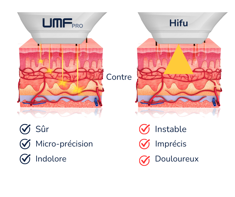 Contrairement aux autres technologies HIFU classiques ou à la radiofréquence (RF), UMFpro? utilise des ultrasons micro-focalisés avec imagerie en temps réel pour délivrer l?énergie à la profondeur exacte du SMAS, ainsi qu?aux couches plus superficielles.